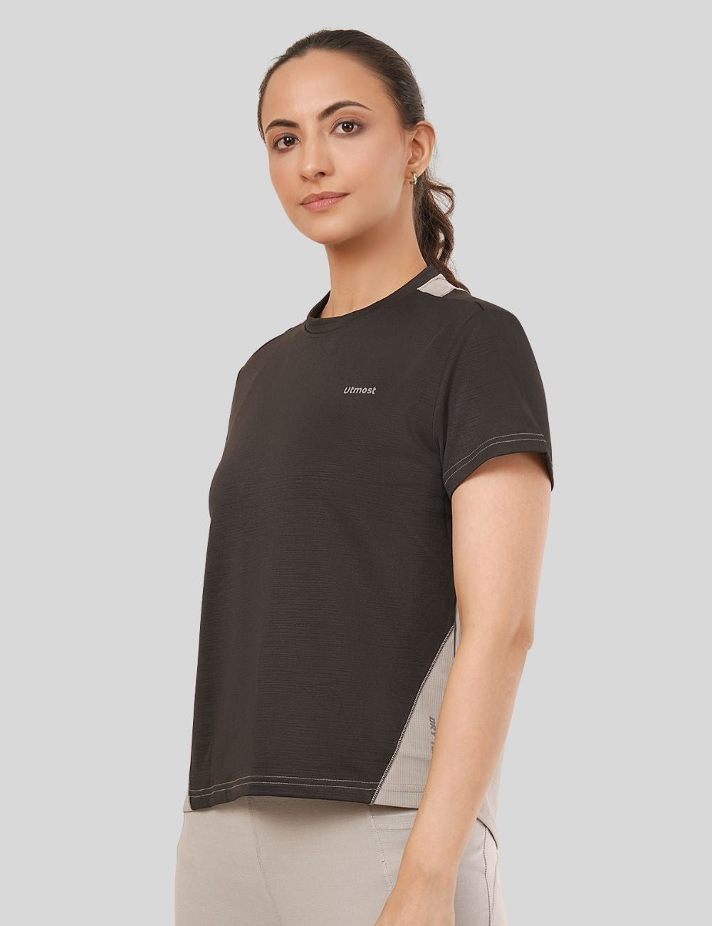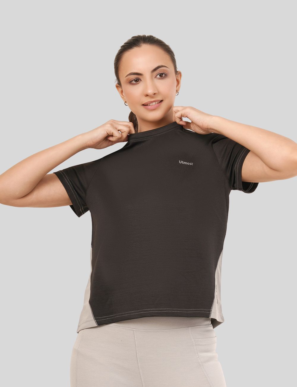 Embrace a fresh, modern look with our Racer Back Dry Fit T-shirt, designed for active women who appreciate contemporary style and premium performance. This X05 model features a beautiful Black and Grey color combo creating a stylish contrast that combines fashion-forward design with advanced fabric technology.