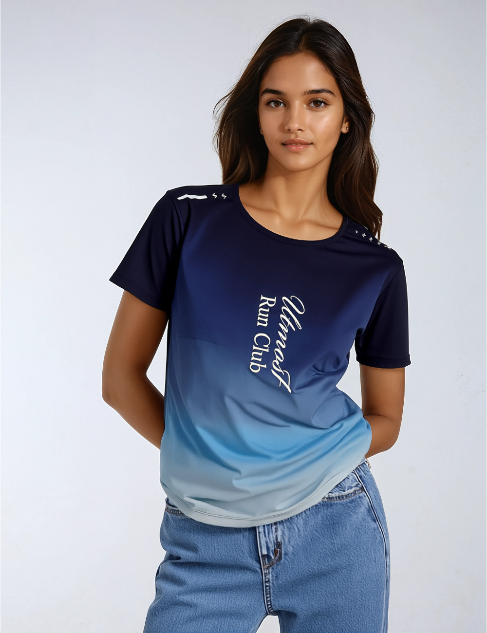 LADIES POLYESTER NAVY BLUE PRINTED DRY FIT T-SHIRT - X01 RUN CLUB (REGULAR FIT)