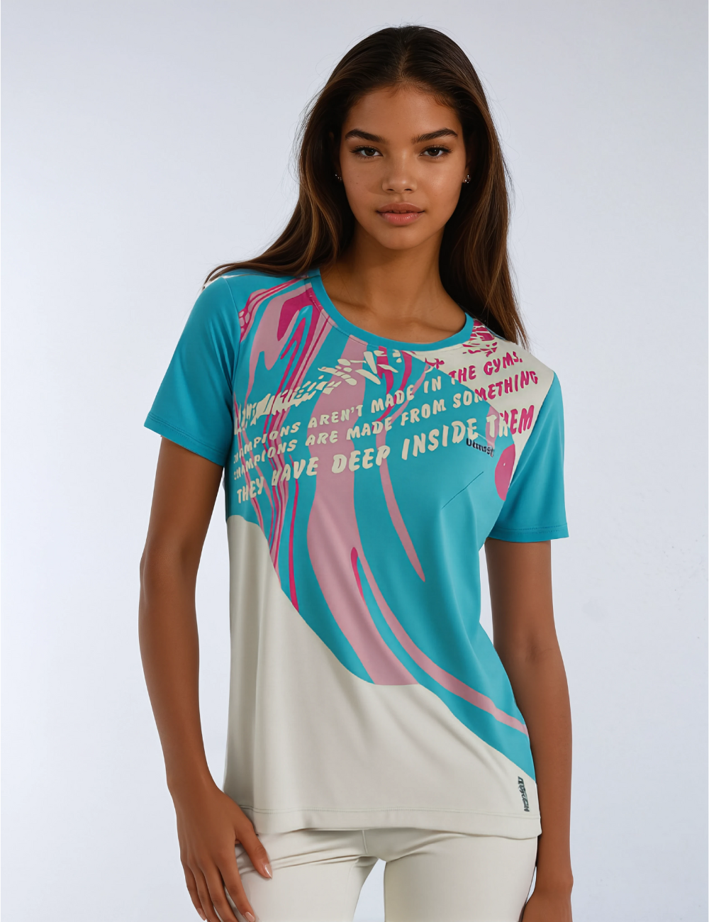 Embrace a fresh, modern look with our Sky Blue Dual Color Dry Fit T-shirt, designed for active women who appreciate contemporary style and premium performance. This X01 model features a beautiful sky blue base with complementary dual-color graphic prints, creating a stylish contrast that combines fashion-forward design with advanced fabric technology.